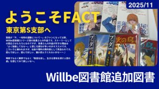 Uncategorizedようこそ!FACT東京S区第2支部【Willbe図書館】2025/11追加図書 こんにちは小学生や中学生が少しでも漫画/映画/本に触れる機会を増やして欲しいと思って無駄に本や漫画を取り揃えている赤穂...2025.11.09Uncategorized